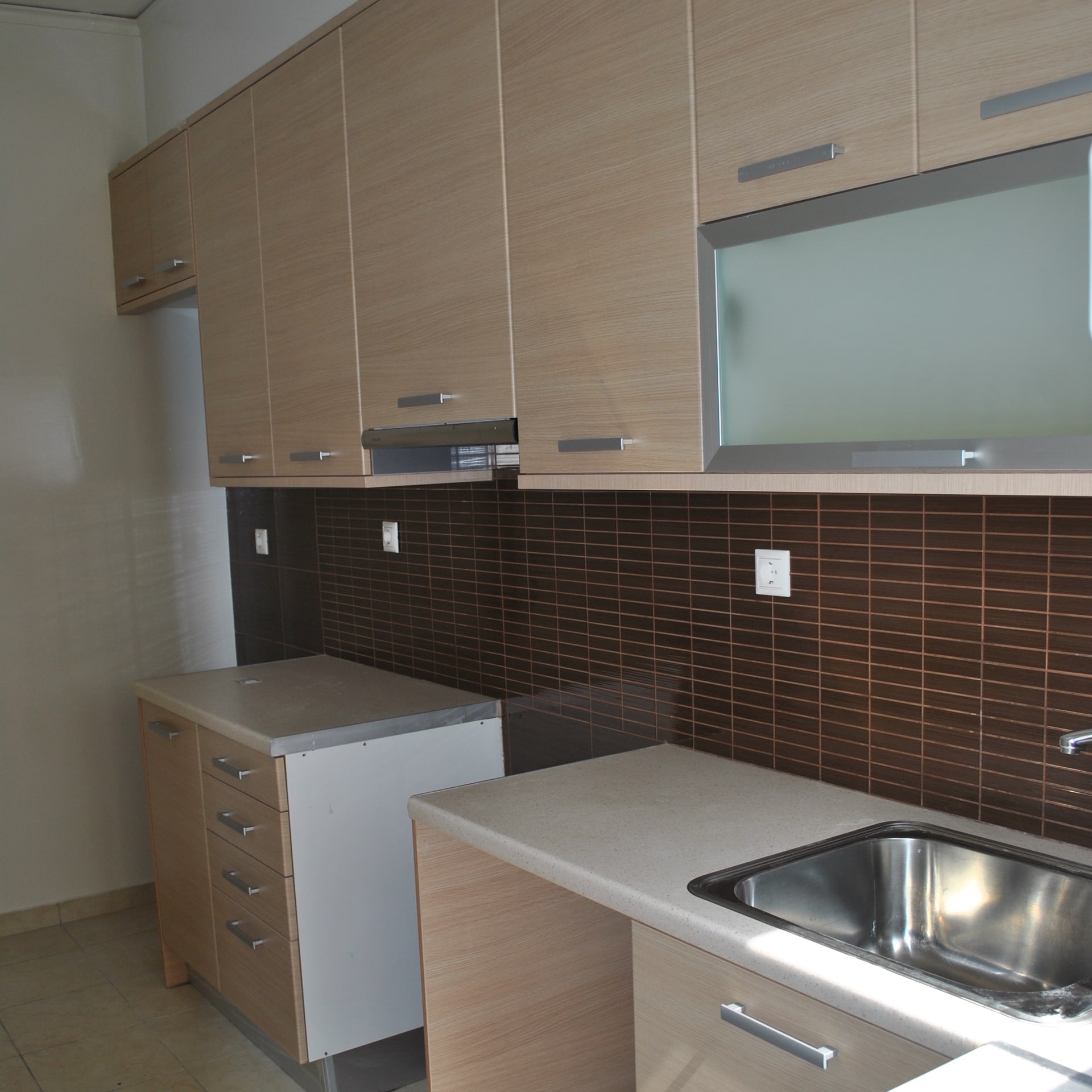Η κουζίνα του διαμερίσματος έχει ανακαινιστεί πλήρως (ηλεκτρολογικές και υδραυλικές εγκαταστάσεις) και φέρει βακελιτικά ντουλάπια, πλακάκια έχουν τοποθετηθεί τόσο στο δάπεδο όσο και στον καθρέπτη της κουζίνας.