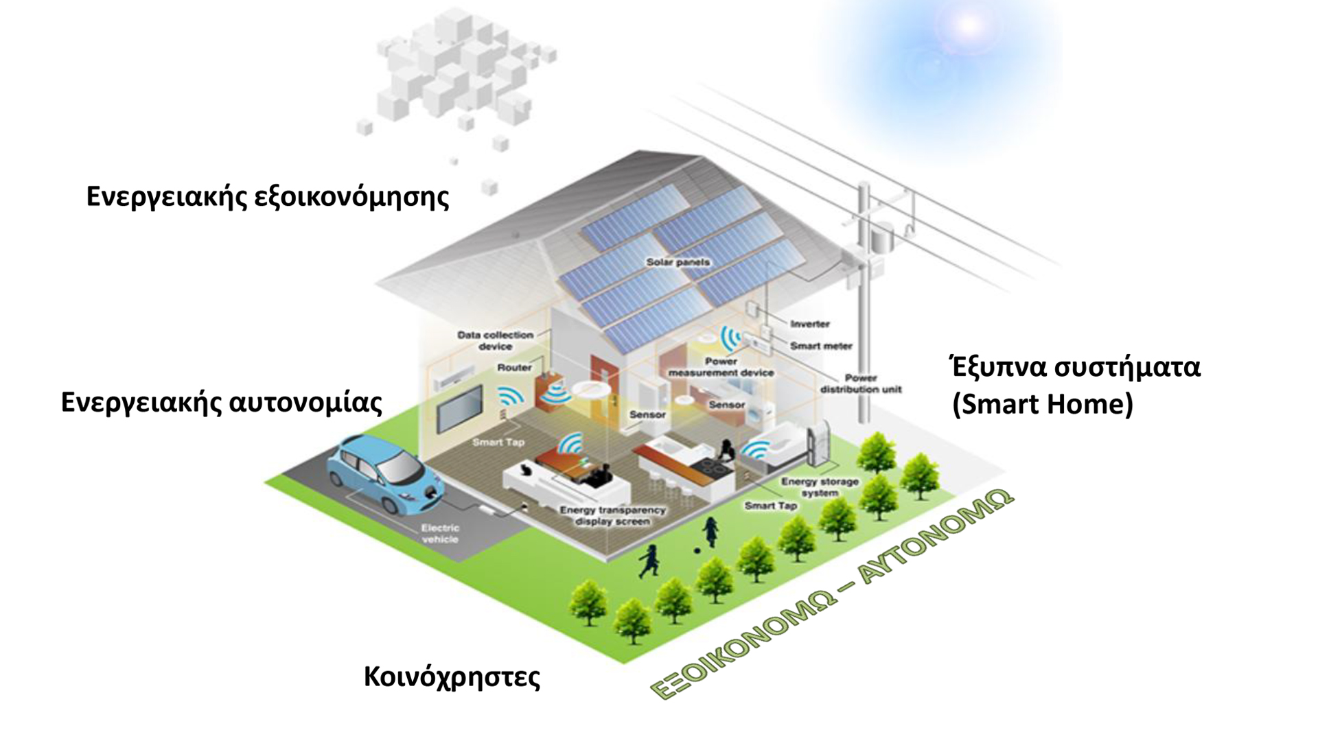 - Έξυπνα συστήματα Smart Home (π.χ. έξυπνος φωτισμός, έξυπνοι θερμοστάτες για διαχείριση συστήματος ψύξης | θέρμανσης, έξυπνοι αισθητήρες για απομακρυσμένο έλεγχο κλπ).