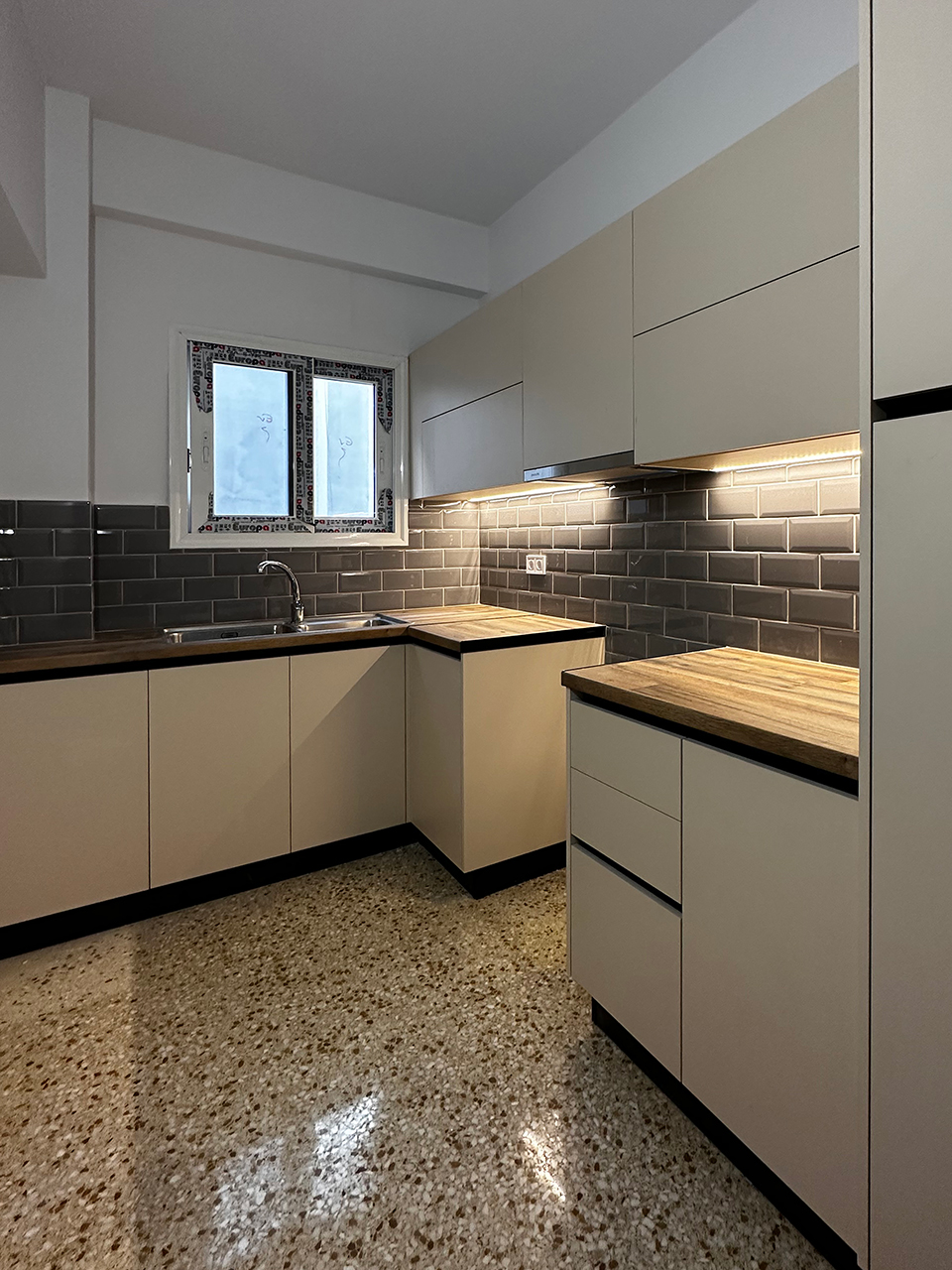 - Η διαδικασία ξεκίνησε με την πλήρη απομάκρυνση παλιών υλικών και εγκαταστάσεων, περιλαμβανομένων των παρωχημένων δαπέδων, κουζινικών επίπλων, και των υπάρχουσες ηλεκτρολογικές και υδραυλικές εγκαταστάσεις.