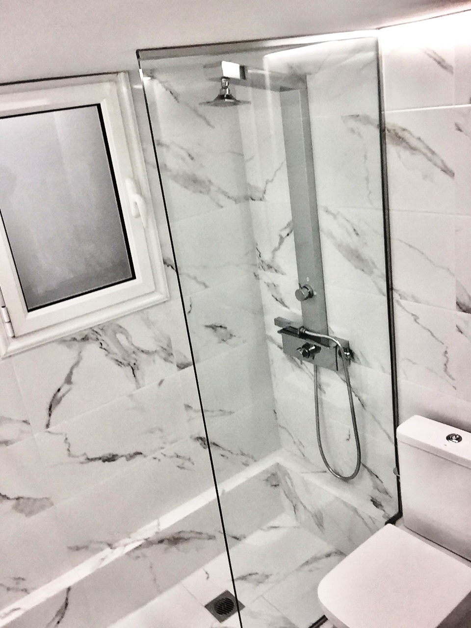 Το μπάνιο εχει ανακαινιστεί πλήρως υδραυλικά, ηλεκτρολογικά & αποχέτευση. Έχει κατασκευαστεί ντουσιέρα με στήλη υδρομασάζ, τοποθετημένη σε γυάλινη καμπίνα από triplex γυαλί.